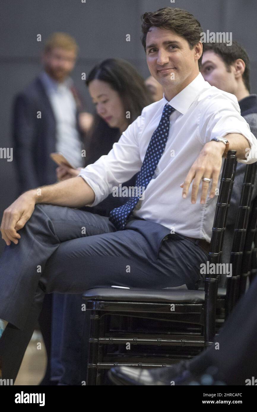 Il Primo Ministro Canadese Justin Trudeau Al Centro Di Sinistra Ascolta Le Presentazioni Prima Di Unirsi A Peter Baker Capo Della Casa Bianca Corrispondente Del New York Times E Catherine Porter Toronto